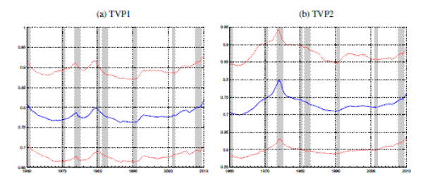Cogley et al.(2010) emphasize non-negligible time-variation in the persistence of the inflation gap. Their approach is however very expensive to compute since the time-varying coefficients of the gaps' VAR process are latent