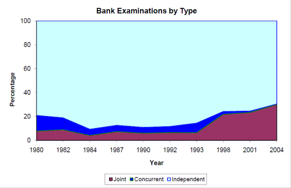 The number of independent examinations relative to the number of joint and concurrent ones, however, cannot be given such interpretation because it is ambiguously related with cooperation. On the one hand, joint and concurrent examinations should be more frequent the more supervisors cooperate for two reasons. First, the better they coordinate their schedules and resources, the easier it becomes for them to examine banks together. Second, the more they rely on each other's reports and the more they alternate with each other in examining banks, the fewer independent examinations they need to perform. On the other hand, when supervisors cooperate in alternate examination programs, they actually reduce the number of joint or concurrent examinations, therefore lowering their number relative to independent ones.