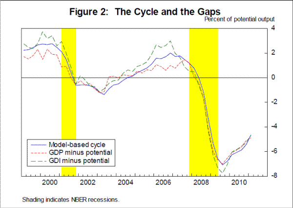 We have four key findings: First, labor-market indicators-such as the unemployment rate and NFB employment-are better cyclical indicators than either GDP or GDI, in the sense that the model chooses to put larger weight on the labor-market indicators in deriving its estimates of the cycle. Second, we also find that, despite evidence of instabilities in the Phillips curve, inflation is also very helpful in identifying the cycle. Third, we find that our model yields estimates of the output gap with a considerably higher signal-to-noise ratio than the univariate approaches explored by Orphanides and van Norden (2002). Finally, we find that although they add little to the identification for the cycle, the income-side measures of output are about as informative as the traditional product-side measures about the level of structural productivity.