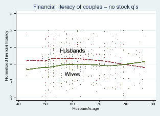 The cross-section can be used as a synthetic cohort to see if patterns of financial knowledge within couples change with age. My model predicts that women should increase their financial knowledge as they approach widowhood. Furthermore, if their husbands' cognition and/or health deteriorate earlier than their own, women will have greater incentive to acquire more knowledge relative to their husbands. Because the survey is not currently longitudinal, there are no measurements of baseline knowledge. To measure changes in financial knowledge in the synthetic cohort, I use husbands' knowledge as a baseline for women.
