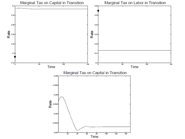 Starting with the benchmark model (A0), figure 1 plots the capital and labor tax rates during the transition. The upper left and right panels of figure 1 plot the tax rate for capital and labor income, respectively. The circles represent the average marginal tax rates under the baseline-fitted U.S. tax policy and the lines are the marginal tax rate throughout the transition.31 The bottom panel of figure 1 excludes the baseline-fitted U.S. tax policy rate so that one can focus on the movement of the tax on capital throughout the transition. Under the baseline-fitted U.S. tax policy, the average marginal tax rate on labor and capital income are approximately 25.5 percent and 19.3 percent, respectively. In the first period of the transition the tax rate on labor income drops to 21.3 percent and the tax on capital income increases to approximately 29.5 percent. After the first period, the tax on labor is constant, while over time, the tax rate on capital falls a small amount before it stabilizes at its new steady state value of 29.3 percent.