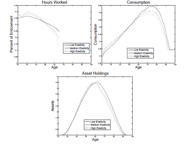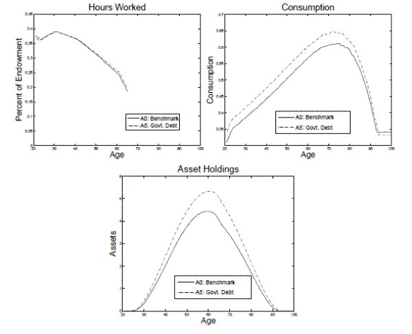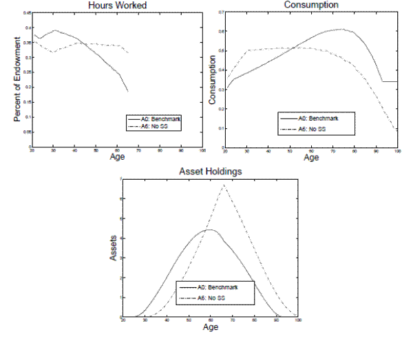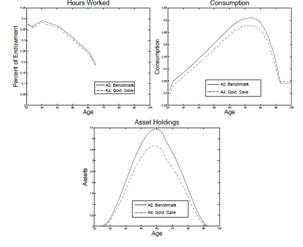 Examining the upper right and bottom panels of figure 10, it is clear that the lower private saving in A4 causes the consumption and asset accumulation profiles to be lower. Overall, the after-tax return to labor is lower in A4 which translates into the labor supply profile being lower.