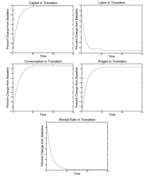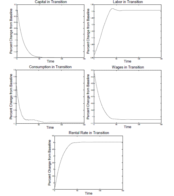 When examining the welfare impacts of adopting the optimal tax policy it is useful to analyze the transition from the steady state under the current tax policy to the steady state under the optimal tax policy. In order to assess the transition path it is necessary to take a stand on how the tax policy adjusts as the economy moves towards the new steady state. I assume that the economy starts at the steady state under the baseline-fitted U.S. tax policy. In the first period of the analysis, the government imposes the optimal labor income tax rate. In each period the government adjusts the tax on capital in order to fulfill their budget constraint. Over time the economy converges to its new steady state which is the one computed under the optimal tax policy. I analyze the transitions in both the benchmark and alternative specification models.