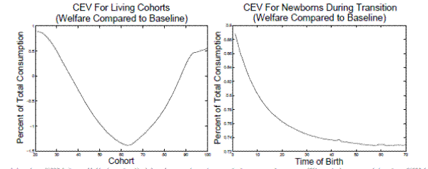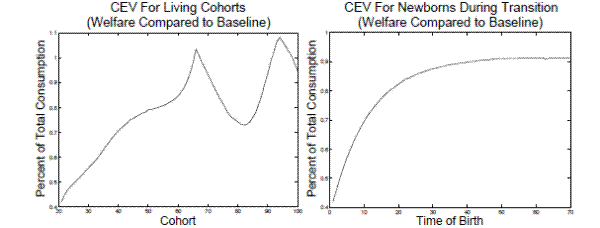 Note: The figures are the percent change from the steady state under the baseline-fitted U.S. tax policy.Welfare in the transition needs to be examined for two separate groups. The first group is those that are alive at the time of the tax policy change and the second group is those that are born during the transition. The left panel of figure 3 plots the CEV (baseline) for all living individuals at the time the tax change is enacted (the first group). The x-axis for this plot is the age of the cohort when the tax change is enacted. Within the living individuals, the channels by which the tax change effects welfare differ between retired and working individuals. During the transition, there are two counteracting effects on the previously retired generation's welfare. First, the tax on capital increases which reduces the after tax return to their savings. However, since the new steady state level of capital is lower, agents increase consume in order to deplete their savings throughout the transition. The increase in consumption increase their utility.32 For the younger retired generations who live for more periods, the decrease in the value of savings dominates and their welfare drops. Conversely, for the older retired generations, the increase in consumption dominates and their welfare increases.