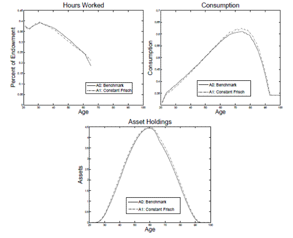 The second reason that the optimal tax on capital increases is that the higher Frisch elasticities enhances the motive for an age-dependent tax on labor income. Figure 13 plots the life cycle profiles for the three different calibrations. The upper left panel of the figure demonstrates that as the model is calibrated to match a higher Frisch elasticities the relative change between the hours he works when he is young and old increases. A larger drop in hours enhances the motive for an age-dependent tax on labor income. Since the government cannot condition labor income taxes on ages, they increase the tax on capital.