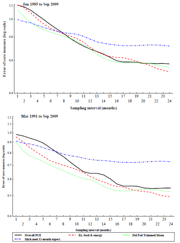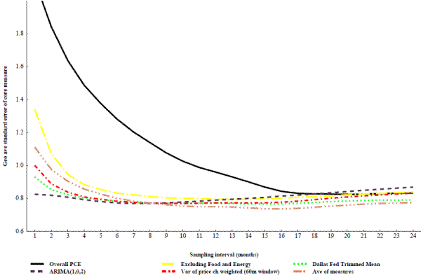 One the other hand, when each measure is examined at its best interval the difference across measures is much less pronounced. Overall PCE inflation still performs the worst, then excluding food and energy performs next worst, and the other measures perform better than these two measures, but the difference is small. The error from using excluding food and energy at its best interval (0.79 at an interval of 13 months) is only slightly higher than the error when using the best measure, the Dallas Fed trimmed mean at its best interval (0.77 at an interval of 15 months), and only slightly lower than using overall PCE inflation at its best interval (0.82 at an interval of 20 months). Assessing whether the differences across measures are statistically significant in a formal test would be difficult since the 15 different specifications are not independent.19