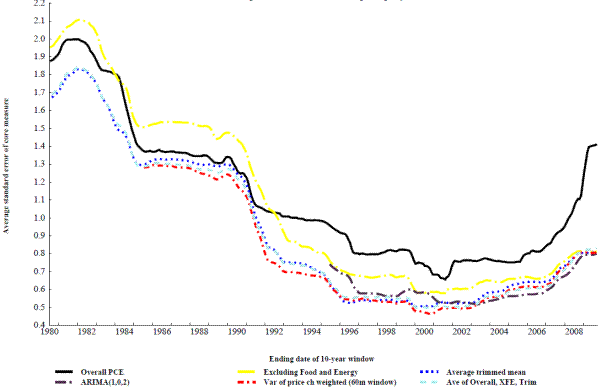 Figures 6 through 9 display the average performance over the 15 specifications for the core inflation measures listed in table 1. As before, a logarithmic vertical axis is used to emphasis differences across the measures. For comparison across the types of core measures figure 10 takes some of the best performing measures from each type and displays them on a non-logarithmic axis.