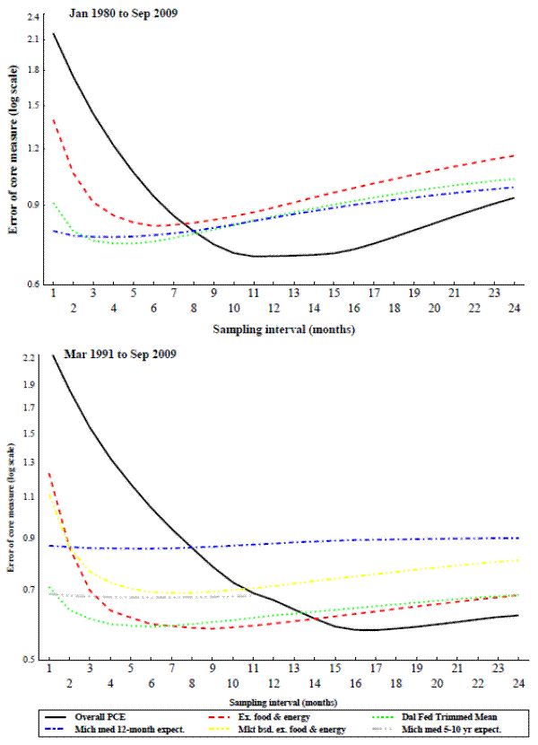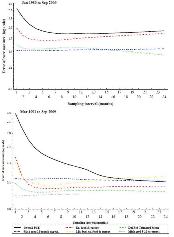 Figure 1 displays the standard error of some prominent core inflation indexes using a centered 36-month moving average of headline PCE inflation as trend inflation, Figure 2 shows the same data, but uses a Baxter-King band pass filter to measure trend inflation.12 The vertical axes in the figures use a logarithmic scale to emphasize the percentage, rather than the absolute, differences in fit across the core inflation indexes. The horizontal axis in each panel lists the number of months used in constructing the core measure's inflation rate (i.e., the sampling interval, s in formula 1). The two panels of each figure cover the time periods starting in 1980 and in 1991, with the core inflation measures being constructed through the summer of 2009, which is the most recent data available while still allowing enough additional data points to construct relatively reliable benchmarks for the comparison.13