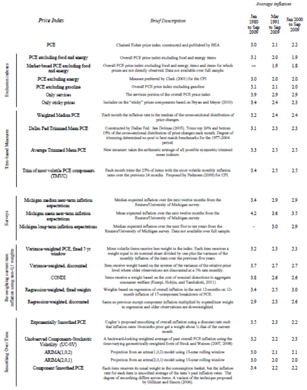 This paper examines a number of alternative PCE price inflation measures including overall PCE inflation, PCE inflation excluding food and energy, trimmed mean PCE inflation, component-smoothed inflation, variance-weighted inflation, inflation with weights based on disaggregated regressions, and survey measures of inflation expectations. When averaging across a handful of specifications based on the primary uses of a core inflation measure three conclusions arise: 1. Inflation rates for nearly all the measures best track ex-post trend inflation or predict future overall inflation when they are averaged over a considerable number of months. Overall PCE price inflation should be averaged over 18 months or longer. A shorter averaging period is appropriate for core measures, often on the order of 12 months. 2. Even after appropriately averaging each index, core inflation indexes generally perform better than overall inflation. 3. Exclusion indexes, such as PCE excluding food and energy, perform slightly worse than many other possible core inflation measures; trimmed mean PCE, or a variance-weighted index, may be better choice for a summary inflation measure