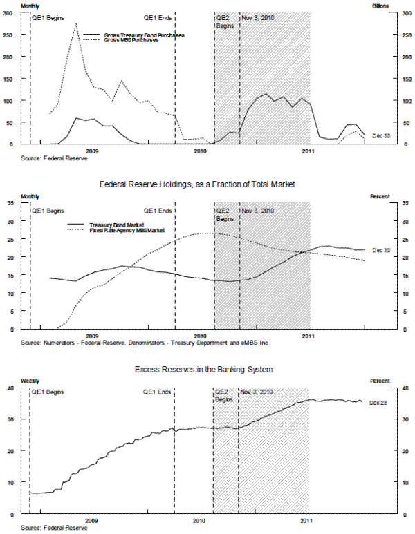 QE2 was followed by a monetary action popularly referred to as "Operation Twist." In September, 2011, the FOMC decided to purchase $400 billion in longer maturity Treasury bonds to replace $400 billion in shorter-term Treasury securities.3 In addition, the FOMC decided to maintain the size of the Federal Reserve's MBS portfolio by reinvesting proceeds from the MBS portfolio into purchases of MBS. Both of these actions were designed to lengthen (or, in the case of MBS to maintain) the maturity of the Federal Reserve's portfolio and thereby place downward pressure on longer-term interest rates. Operation Twist was still in place at year-end 2011 (when we end our empirical analysis).