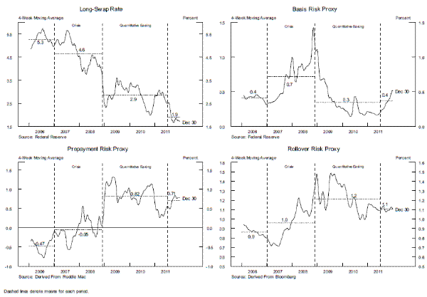 Using a long-term swap to hedge mortgage interest rate risk would still leave the holder of the MBS with a significant maturity mismatch and some basis risk if their underlying funding structure is not similar to three-month Libor.19 Banks typically have a fairly short maturity of liabilities (e.g., one or two years). Our representative bank is modeled as using a swap to convert its three-month Libor payment for an average yield on one-year and two-year Treasury securities in order to help match the effective maturity of its liabilities. Because the bank would still likely continue to have basis risk (since its liability structure would probably be more sensitive to Treasury rates than to the average swap rates), we also include the spread between the short-term swap rate and the Treasury rate in the regression as a proxy for the cost of this basis risk. As shown in the upper-right figure 3, our proxy for basis risk increased significantly during the crisis, but fell to relatively low levels after the Federal Reserve's intervention in the MBS market and remained low during QE2. During "Operation Twist," our basis risk proxy has shown an upward trend because the Treasury yield curve remained flatt while the the swap yield curve drifted upward.
