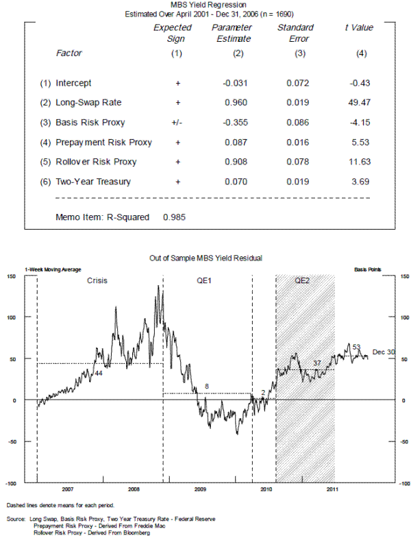 To consider the effects of the financial crisis and of the Federal Reserve's interventions, we examine the out-of-sample fit of the regressions estimated. As shown in the bottom panel of figure 4, the out-of-sample residuals for the MBS yields suggest that actual yields were higher than expected yields during the crisis, fell significantly lower than expected (i.e. were negative) during QE1,24 and once again averaged higher than expected (i.e., were positive) over the course of QE2 and "Operation Twist."
