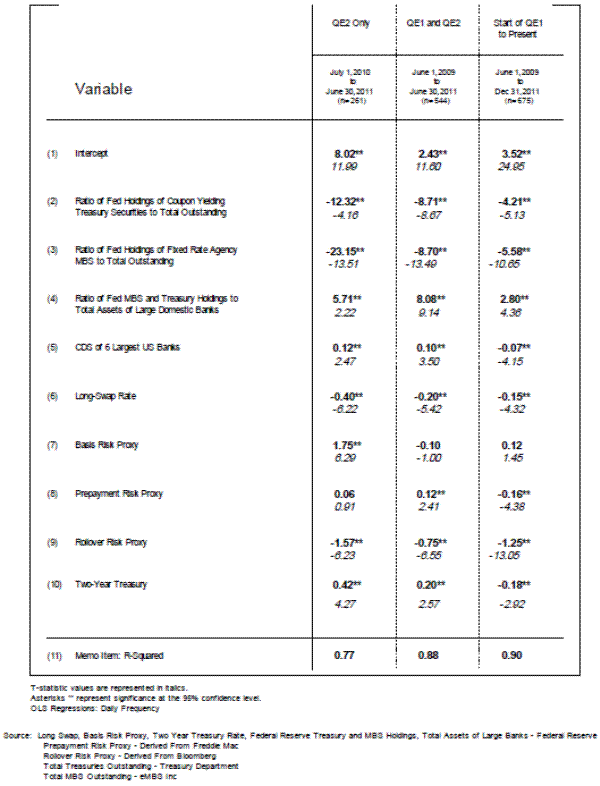 For both the QE2 period by itself and the QE1 and QE2 periods together, we estimate the effects of the Federal Reserve's purchases using our MBS yield regression residuals as the dependent variable.25 As independent variables, we use the Federal Reserve's share of Treasury bonds outstanding, the Federal Reserve's share of MBS outstanding, and the sum of the Federal Reserve's Treasury bonds and MBS holdings divided by the assets held by the largest domestic US banks. The first two independent variables measure the possible effects of withdrawing (or adding) duration to the fixed-income markets, while the third independent variable is a close proxy of the proportion of excess reserves held by the banks that dominate the banking system.