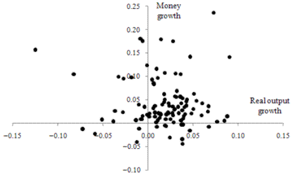 An additional possibility is that, while nonneutral effects of monetary policy are evident when small groups of years are considered, a long sample of data delivers variations in money wide enough for the long-run neutrality property to dominate the picture. A parallel is provided by the U.S. Phillips curve experience. As Lucas (1996, pp. 666-667) emphasizes, downward-sloping Phillips curves are visible from inflation/unemployment scatter plots for segments of the postwar sample, but when all segments are combined into a single sample, no inflation/unemployment relationship is visible. In effect, the true Phillips curve relationship is between one "deviation" variable-inflation relative to expected inflation-and another-unemployment relative to its natural rate. Yet it is possible to find a relationship between the absolute levels of inflation and unemployment over short samples because variations in the expected-inflation term (and in the natural rate of unemployment) are typically muted in the short run. Likewise, in studying money/income relations, output growth and real money growth might be related in the long run thanks to the fact that the money demand function is structural and is expressed in real terms;22 but this long-run relationship will only engender a relationship between nominal money growth and output growth over short samples in which real money growth variation is dominated by nominal money growth behavior. Bringing all the short samples together might deliver a zero money growth/output growth correlation, provided real money growth behaves dissimilarly to nominal money growth over long stretches of data.