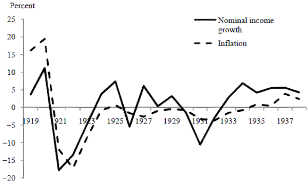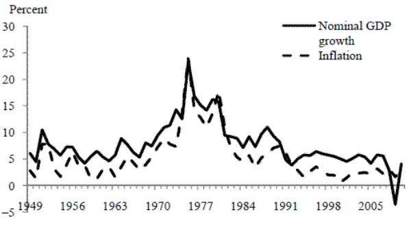 A number of considerations suggest that this factor is unlikely to be an important consideration in the case of long-run data for the United Kingdom. It should be stressed at the outset that monetary policy affects output via its influence on nominal aggregate demand. Thus, one should generally expect stabilization of output to be manifested also in stabilization of nominal income. In practice this is indeed what occurs in periods of smooth output behavior, if the Great Moderation period up to 2007 in the United States and the United Kingdom is a good guide. But the 1873-1975 period did not witness stabilization of nominal income growth: measured by 100 times the log difference, this growth rate ranged from minus 17.8 percent to plus 22.4 percent in Friedman and Schwartz's annual data, with a standard deviation of 6.3 percent.