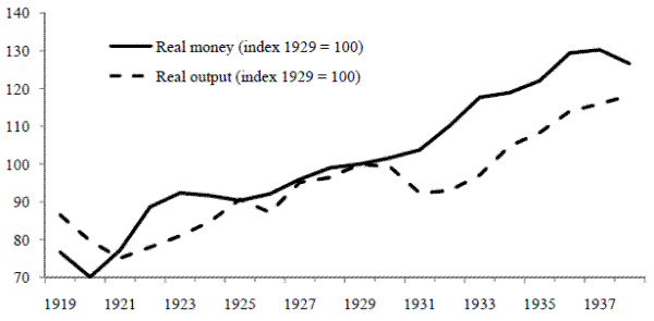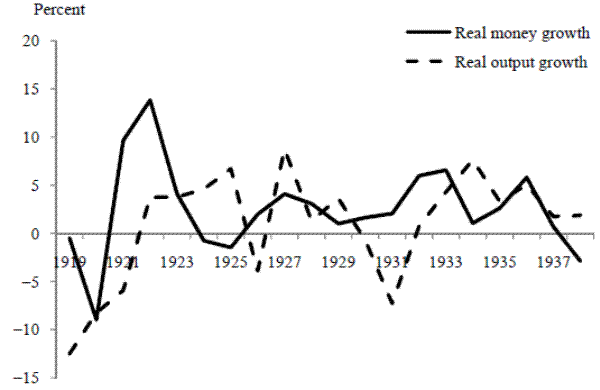 An additional contribution of the present paper is to contribute evidence that refutes real business cycle (RBC) interpretations of the interwar period (1919-1938) in the United Kingdom. The interwar period superficially seems, as noted above, to feature a close relationship between money and other nominal variables but little relation between money and real variables. Little wonder, then, that the RBC literature has had a field day studying these years. Most notably, an important study by Cole and Ohanian (2002) argues that the United Kingdom's interwar output depression cannot be understood by reference to the behavior of the nominal money stock, and that it should instead be viewed as the result of shocks to aggregate supply. The present paper, in contrast, brings out the connections between nominal and real variables that can be gleaned from a closer study of the annual data. It therefore helps to affirm the importance of monetary policy for real behavior over the U.K. interwar period. The interpretation offered here does not deny the primacy of real factors for the longer-run determination of output behavior, but it does put monetary policy at center stage in determining the response of aggregate real activity to real shocks at the business cycle frequency.