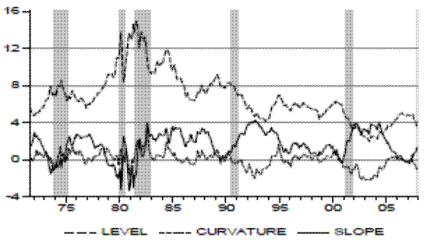Figure 1 plots the level, curvature, and slope of the yield curve with the shaded regions indicating the recession periods as dated by the National Bureau of Economic Research (NBER). The level is highly persistent and it is often interpreted as the long run component of the yield curve. The curvature and the slope are considered the medium run and the short run components, respectively. Diebold and Li (2006) and Diebold, Rudebusch and Aruoba (2006) show that the level is closely associated with inflation expectations, while the slope is related to future economic activity. The curvature is not generally associated with any specific macroeconomic variable. However, notice that the curvature displays correlation with the NBER-dated recessions, although weaker than the term spread (slope).
