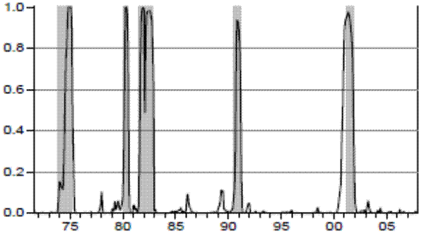 Figure 10: Probabilities of Recessions from the Probit Model, NBER-Dated Recessions (Shaded Area)
