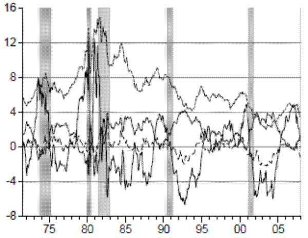 The tests indicate strong evidence of several breaks in the components of the yield curve. First, all three series display a break in volatility between 1980:05 and 1981:08. In the case of the term spread, there is also strong evidence of a break in its mean in this period. Several papers have found instability in the predictive power of the yield curve, particularly with respect to the 1990-1991 recession.12 We find significant structural breaks in the mean of both the curvature and the level series around 1990:06 and 1990:12. In addition, the variance of the level also displays a break in 1990:11. On the other hand, the tests applied to the growth rate of industrial production find a break in its volatility in 1983:12. These results are summarized in Table 1.
