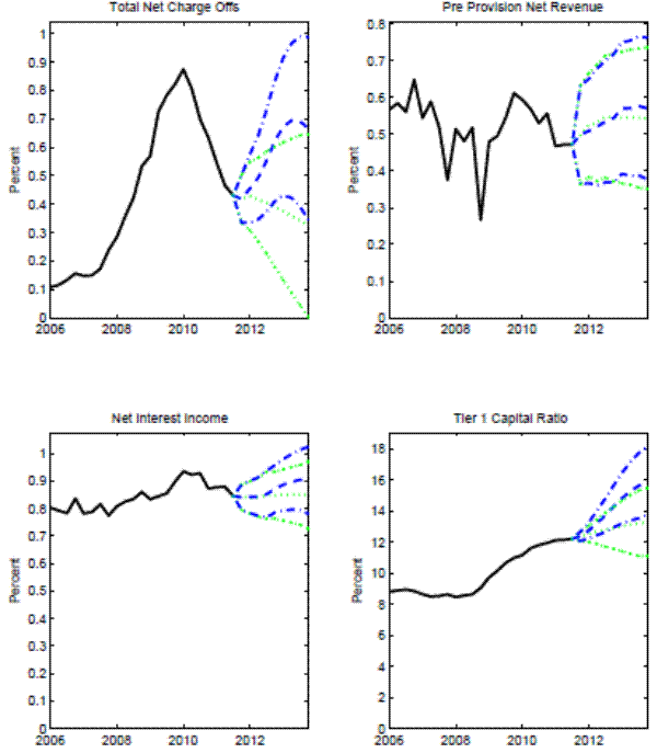 When we apply our preferred forecast models to macro scenarios used in most recent stress test conducted by the Federal Reserve, CCAR 2012, we find little sensitivity of the banking measures to scenarios that are meant to capture large macroeconomic differences. In all cases, for most of 9-quarter forecast horizon, the point estimates for the stress scenario are inside the 2-RMSE uncertainty bands around the forecast conditional on the baseline scenario.
