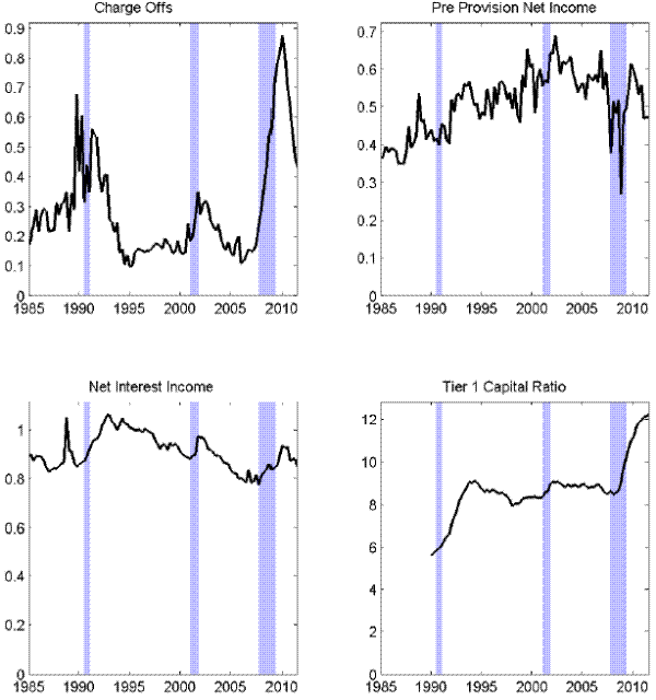Quarterly flows for total net chargeoffs are expressed as a percentage of total loans and leases; quarterly flows for PPNR are expressed as a percentage of total assets. The tier-1 regulatory capital is expressed as a quarterly ratio of risk weighted assets; and, the net interest margin is expressed as the percentage of net interest income over interest earning assets.