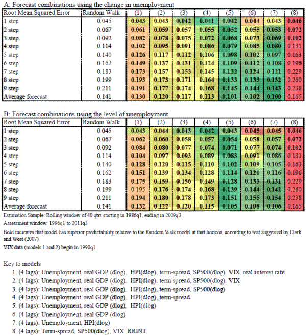 Figure 2 focuses on results for total net chargeoffs. Model 5, with the change in unemployment, real GDP, and HPI has the lowest RMSE at all horizons and beats a random walk also at all horizons. Models 6 and 7, both include unemployment, but drop HPI and GDP in turn. In both cases, the combination forecast still beats a random walk forecast, based on RMSE, if a bit more modestly. In particular, HPI seems to help at reducing the RMSE at the shorter forecast horizons.