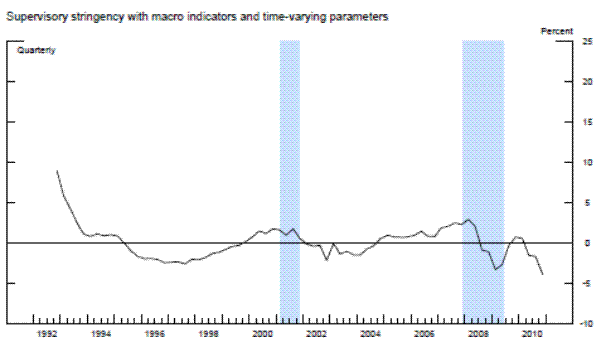 Our approaches generally produce smaller estimates of stringency in both the early 1990s and throughout the period of 2007 to 2011 than the strategy used by previous researchers of interpreting the coefficients on time fixed effects. Although one may question whether supervisory standards should reflect assessments of both the local and the national economic environment, this is a normative critique. Both on average and in the aggregate, banks lend to firms, for example, that operate in markets other than the market where the banks or firms are headquarted (or where banks hold most of their deposits). Also, the macroeconomic and financial environment may be good indicators of expected changes in bank conditions over the next several quarters and broader risks facing banks. Therefore, the the national economic environment and financial conditions may well be an important factor in determining aggregate supervisory standards.