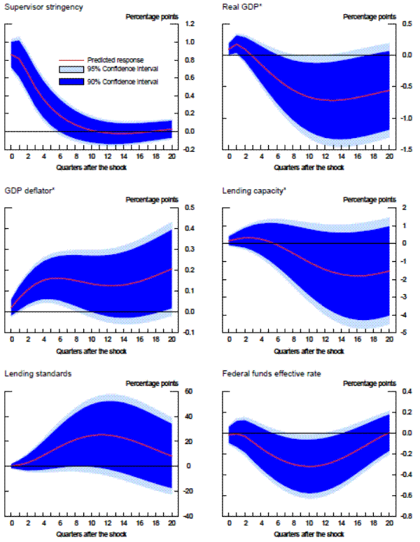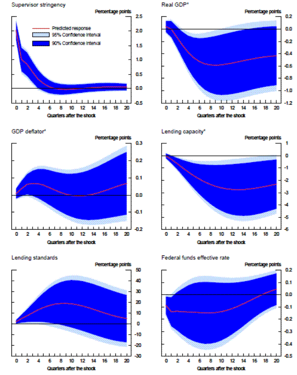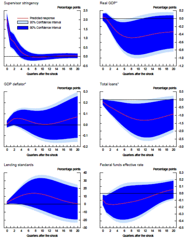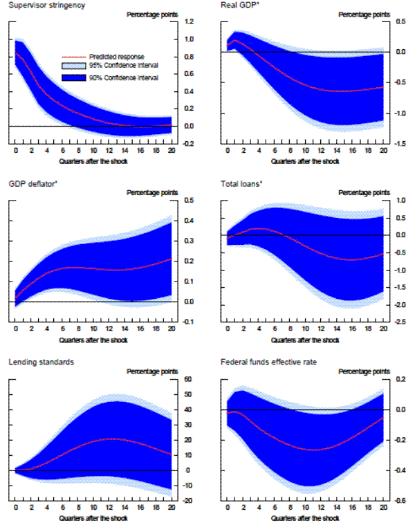 For this analysis, we turn to a fairly standard vector autoregression (VAR) model that incorporates the time series of supervisory stringency produced by the modified random-effects ordered probit specification. Because this series is constructed to be orthogonal in the current period to a number of macroeconomic variables, including GDP and the effective federal funds rate, we choose to order it first.28 The other variables in the model, as they are ordered, are growth of nominal GDP, inflation as measured by the GDP deflator, the growth of total loans, the aggregate change in bank lending standards to households and businesses as constructed from the Federal Reserve's Senior Loan Officer Opinion Survey29 , and the effective federal funds rate. We also run a second VAR in which we substitute total lending capacity for total loans to narrow in on the supply restraints.30