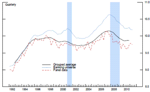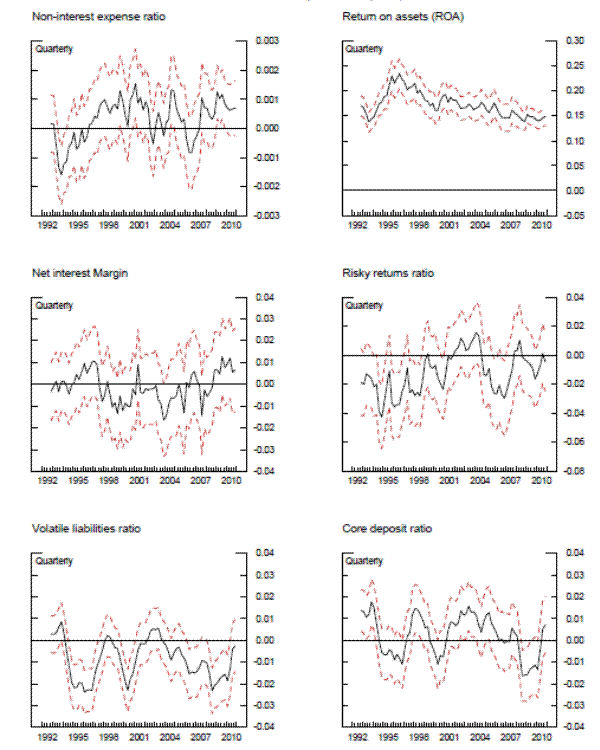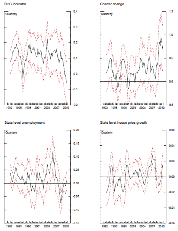 Exhibit 9 describes the key results from the repeated cross-section analysis. The black line in the top panel plots the estimated aggregate bank conditions,
