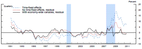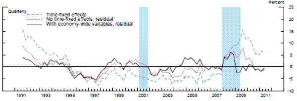 To compare our results with the previous literature, we next run the panel regression models with the same bank-specific and structural variables as in the previous two exercises, but with time fixed effects.24 For each model with the time-fixed effects, we index the level of supervisory stringency to the average of the fixed effects over whole sample period in order to place it on the same scale as the residuals. Once again, whether we used a fixed-effects linear model, a random-effects linear model with an identifying assumption to mitigate the problem of correlation between the random effect and the regressors, or the analogous modified random-effects ordered-probit model, the estimates of the time fixed effects are very similar to each other-mainly, supervisory standards were strict in the early 1990s and became strict again in the beginning of 2008. However, the magnitude of the fixed effects estimates in the early 1990s and from 2008 to present are much larger than the estimates of supervisory stringency inferred instead from the residuals in models that include economy-wide variables. The coefficients on the time fixed effects across the different specifications peak at 15 to 20 percent in the middle of 2009, before retreating some in more recent quarters, though to levels that remain still elevated as compared to supervisory stringency prior to 2008. In addition, across all three specifications with time fixed effects, supervisory stringency, as of the middle of 2011, was still between 5 percent and 10 percent.