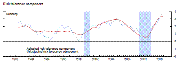 in equation 11) and the composition component reveals that for most of the period aggregate conditions largely paralleled risk tolerance rather than composition. The composition portion (based on actual changes in bank balance sheets and economic indicators, etc.) started out fairly low in the