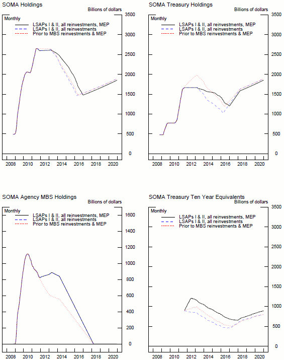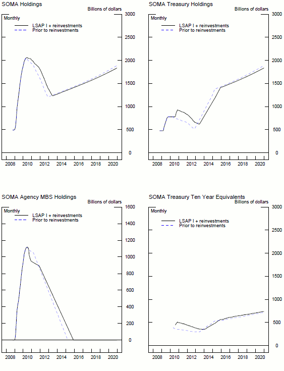 The projection for the Federal Reserve's balance sheet at the time when the first LSAP occurred is constructed using expectations for interest rates and other key variables at the time of the implementation of the program. It is helpful to remember that at the inception of LSAP1, the Committee stated that all purchases would be completed by December 2009. As the program wore on, the Committee revised its estimate to the first quarter of 2010 "in order to promote a smooth transition in markets."23 As a result, the projections here reflect the earlier completion date of the LSAP1 program. Another assumption at the time of LSAP1 was that as the agency securities prepaid or matured, that these securities would roll off the portfolio, i.e., there was no expectation of reinvestment at this time.