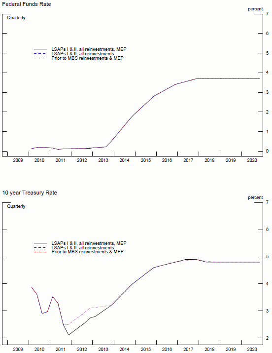 For this counterfactual, we used the short-run Blue Chip forecast from September 2010 smoothed into the Blue Chip forecast from December 2010. Although this forecast may have contained some expectation of an upcoming LSAP program, we would like the forecast to contain the effect of the reinvestment program announced in August 2010. As shown in the top panel of figure 8, under this scenario, the federal funds rate lifts off in the second quarter of 2011. The ten year rate reaches its steady state level of about 5 percent in late 2014.