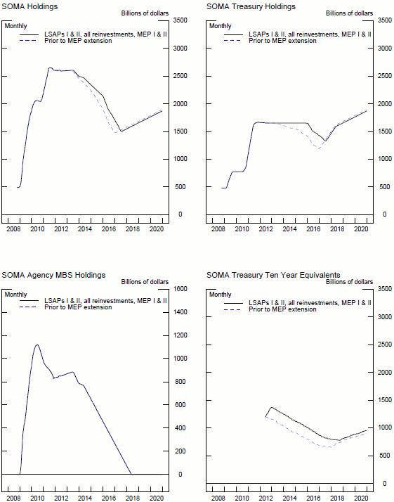 For the MEP, the Desk sold $400 billion of shorter-dated Treasury securities and purchased an equal amount of long-dated Treasury securities. For the MBS reinvestment program, which had the stated objective of supporting conditions in mortgage markets, both maturing and prepaying agency securities (both debt and MBS) were rolled over into MBS. This latter policy replaced the reinvestment program where these securities were rolled over into Treasury securities. These two policies combined had the effect of keeping roughly constant the holdings of each security type in the SOMA portfolio, but at the same time, lengthening the maturity of the portfolio. On the announcement of the two programs, the 10 year yield dropped 7 basis points.31