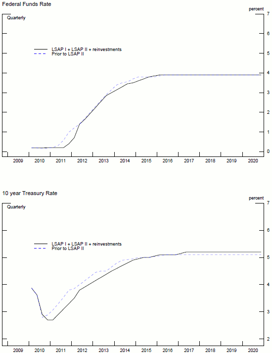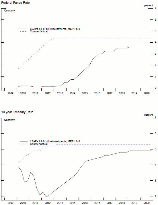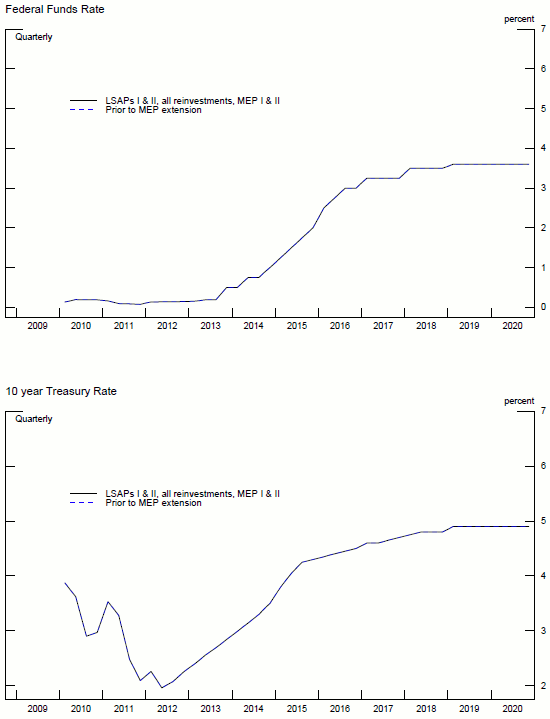 For this counterfactual, we use interest rates and balance sheet projections starting in June 2010, the end of the first LSAP program. As shown in the top panel of figure 5, investors expected the federal funds rate to remain at its lower bound until October 2010. The ten year rate was expected to climb as well, and reach its steady-state level by mid-2014.