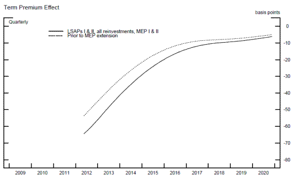 The change in the composition of the balance sheet has a notable impact on the estimated term premium effect. As shown in figure 12 and column 1 of table 5, the estimated maximum effect of the MEP and MBS reinvestment programs combined was -20 basis points. The vast majority, 17 basis points, is potentially attributed to the MEP. Therefore, although the par amount of the MEP program was less than the second LSAP program, the impact on the term premium is estimated to be about 1 ½ times as large.