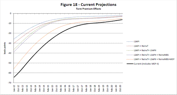 Figure 18 displays the estimated term premium effect associated with each program. As indicated by the solid black line, we estimate that the Federal Reserve's asset programs are currently depressing the 10-year Treasury yield by 64 basis points.32 About one-third of this effect can be potentially associated with LSAP1 actions, another 8 basis points is a result of LSAP2 actions, 25 basis points possibly reflects both the initial MEP and its extension, and the remainder is likely associated with reinvestment. Although one of the main drivers in differences of the programs is the change in expectations regarding interest rates, there are also differences that result from using realized balance sheet quantities instead of projected ones. For example, the projection at the time of LSAP1 had much slower agency MBS prepayments than what actually occurred, as interest rates declined much more than what was expected at the time of the implementation of LSAP1. Consequently, the realized term premium effect was likely a bit smaller than the projected term premium effect at the inception of the program.