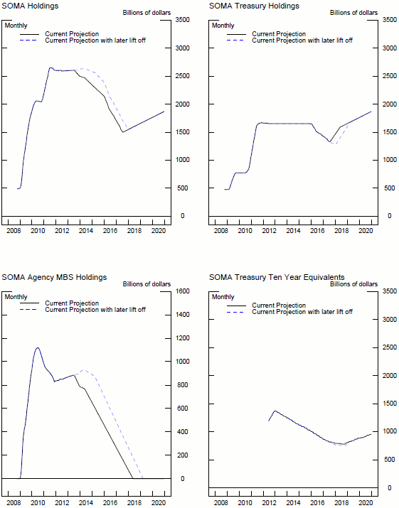 see that projected Treasury holdings are actually lower in the LSAP1 scenario than those in the counterfactual from mid-2010 through mid-2014, reflecting the fact that LSAP1's purchases of MBS holdings boost the SOMA value and Treasury holdings are not needed to offset growth in currency and