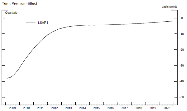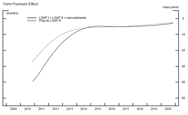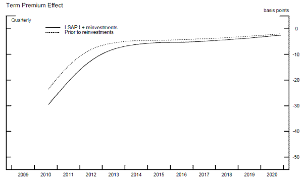 Figure 3 also shows the expected path of decay of the TPE. As the Federal Reserve's balance sheet is projected to slowly return to a more normal level over time, securities are returned to private investors and the TPE becomes less negative. As reported in column 3 of table 5, by early 2013 the estimated TPE associated with the first LSAP program is -6 basis points. This reduction primary reflects two factors: first, the Federal Reserve was not reinvesting the proceeds from prepayments of agency securities and so those securities were essentially returned to private investors; and second, markets expected the funds rate to rise above 25 basis points in June 2010, implying the unwind of unconventional monetary policy well before 2013.