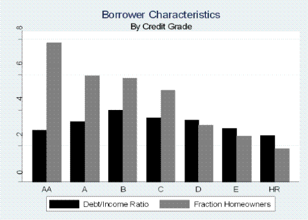 The correlations among key borrower observables are also intuitive. Figure 3 shows that borrowers with higher credit ratings are also generally more likely to be homeowners. Meanwhile the debt to income ratio behaves non-monotonically across credit grades. Both the very best and worst quality borrowers have smaller ratios, as the former are likely to be richer with access to credit, while the latter may have limited access to credit.