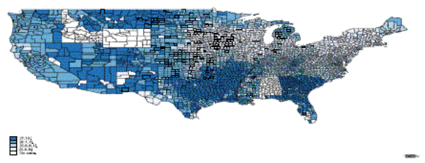 We summarize our proxies for credit availability in Table 1A and report their correlations in Table 1B. Counties in western states were generally larger and less populated than other regions, but the number of banks scaled by area and population are positively correlated in the cross-section. Areas with greater bank density appeared to also have lower interest rates. Figure 1 indicates that counties with lower interest rates were typically in the upper Mid West; credit was costliest in the South.6