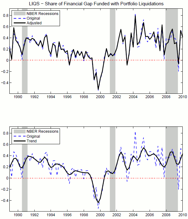 The data in Figure 7 shows some important features. Positive realizations of the series represent quarters when firms liquidate assets or deplete cash reserves. Negative realizations instead represent episodes in which firms are able to borrow from the market not only to cover their financing gap, but also to acquire new financial assets on secondary markets. This phenomenon is particularly pronounced before the burst of the dotcom bubble at the end of the 90s, when the share of corporate mergers and acquisitions had risen to 15% of US GDP in 1999 alone, compared to an average of 4% during the 1980s, ((Weston & Weaver, 2004)). Another important characteristic of the data series is the difference in the relevance of portfolio liquidations in the 2000s, compared to the 1990s. The average fraction of financing gap covered through asset liquidations is lower along the expansion of the 1990s (average contribution amounts to 19.74% of Financing Gap from 1991 to 2001), and higher in the boom of the 2000s (34.27% from 2002 to 2008).