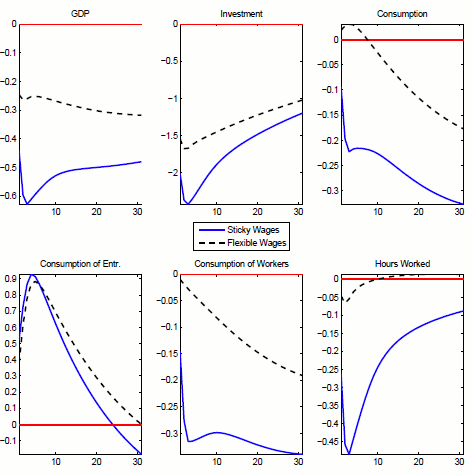 In my model with sticky wages instead there are two classes of agents: entrepreneurs who optimize their intertemporal consumption profile by trading assets on financial markets and building capital, and workers who consume their labor income in every period. On the intertemporal margin, increased financial intermediation costs lower the real rate of return on financial assets, discourage savings and investment and induce entrepreneurs to consume more in the current period. Additionally, the shock induces a drop in aggregate demand that translates into a downward shift in the demand for labor inputs. When workers cannot re-optimize their wages freely, the decrease in labor demand translates into a large drop in the equilibrium amount of hours worked. As a result, the wage bill falls and so does workers' consumption. The drop in workers' consumption dominates over the rise in entrepreneurs' consumption and the reduction in hours amplifies the negative effect of the shock on aggregate output.