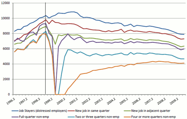 We categorize the remaining flows according to the number of full (that is, observed) quarters of joblessness.13 It is only for these workers that we can state with confidence that they experienced a spell of joblessness. Additionally, about 5-8% of job separators in each sample have no observed positive UI wages in any state to the end of the time series in 2010:4. These would include those who found employment not covered by a state unemployment insurance system and those who dropped out of the labor force. Note also that a person who separates but returns to the same employer in the same or adjacent quarter would not be identified as a separation in our data, because no break in earnings from that employer would be apparent.