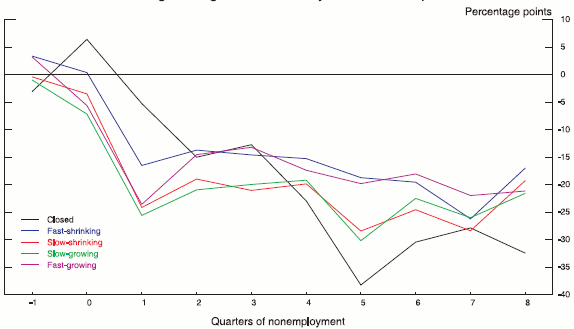 Our results show that the most critical factor for earnings outcomes is whether a worker makes a direct, or at least quick, job-to-job transition. Workers that experience a full quarter or longer spell of nonemployment experience significantly worse earnings outcomes.4 We find that the growth rate of the separating firm is less critical (although it plays some role) once we control for whether a separating worker experiences at least one full quarter of nonemployment. We find that all job separators, including those from distressed and closing firms, do fairly well if they find new work fairly quickly; earnings penalties for job change are concentrated among those separators who do not.