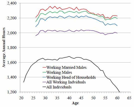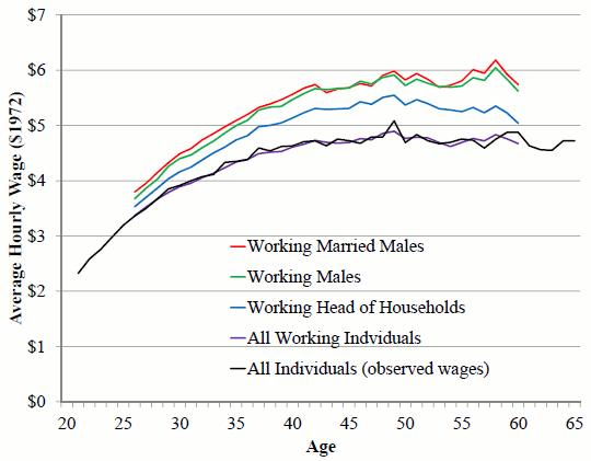 Similar to (Altonji, 1986), I use the Michigan Panel Study of Income Dynamics (PSID). I utilize the waves from 1968 until 1997.18 I use similar procedures to clean the data as employed in (Altonji, 1986). The PSID only reports hourly wages for individuals who are paid on an hourly basis. Therefore, I create a real hourly wage variable for everyone by taking the labor earnings divided by the product of annual hours working for pay and consumption price index for urban individuals. Following (Altonji, 1986), observations which exhibited a 250 percent increase or 60 percent decrease in wages or consumption were treated as missing. Furthermore, observations with swings of more than $13 or wages less than $0.40 in 1972 dollars were treated as missing.19 I do not observe the wealth of the parents for secondary earners. Therefore, I exclude these variables as instruments for changes in wages. I found that making these alterations did not affect the results on the group of individuals for which I have complete coverage. Finally, I adjusted the age variable when an individual reported no change in their age between the annual surveys or reported a change of larger than one year. Figure 1 plots the average annual hours by age for five different groups of people.20 These plots are constructed by taking the traditional panel (pseudo panel) and averaging across all individuals (cohorts) by age. The black line is the average annual hours for all individuals. Compared to the other four lines, which are plots of the average hours for the subset of the sample that is working, the profile for all individuals decreases much more rapidly towards the end of the working life. This rapid decent indicates that many older aged individuals stop working. Figure 2 plots the average wage profiles for various groups of individuals by age. The wage profiles tend to be upward sloping over a majority of the lifetime for all the different groups. The black line plots the average of all the observed wages which is used to estimate the macro Frisch elasticity.