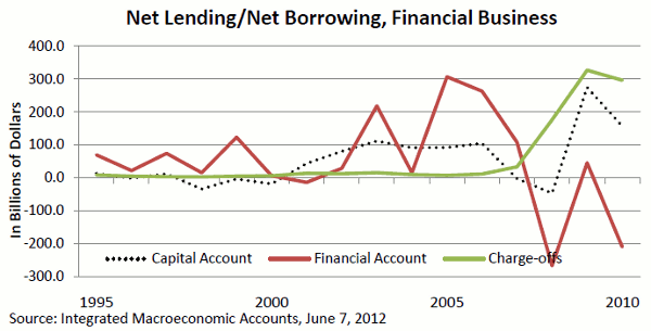 Source: Integrated Macroeconomic Accounts, June 7, 2012.Chart 5 compares the capital account total net lending or net borrowing for all domestic sectors (the black line) with the financial account measure (the red line). The two lines are very close to each other and hover around zero until about 1980. From that point forward, the U.S. becomes an increasingly larger net borrower vis-à-vis the rest of the world. The two measures of net lending/net borrowing remain fairly similar, although the financial account measure is more volatile, until around 2008, the year of the financial crisis, when the two lines diverge sharply. This divergence could be partly due to data sources subject to historical benchmark revisions, but is more likely due to data gaps in the financial accounts. These data gaps could reflect off-balance sheet data that have not been captured completely, such as derivatives, or transactions taking place at a level of business structure not currently included in any sector in the accounts, such as nonfinancial holding companies. Also, the treatment of intangibles in the capital and financial accounts could be inconsistent. These data gaps and differences were probably more significant during the financial crisis, and perhaps unsurprisingly, when you compare the two measures of net lending/net borrowing by sector, as shown in table 1 above, the greatest differences appear to be for the nonfinancial corporate business sector (line 4) and the financial business sector (line 5). In 2009, the two measures of total NLNB (chart 5) moved closer together as the economy showed some improvement and have maintained a similar pattern in the most recent years.