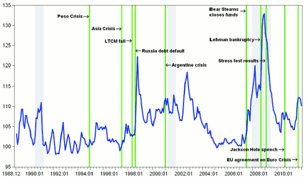 the Argentine debt default, or perhaps the bankruptcy of Worldcom; the fourth, which begins in August 2007 and ends in April 2009 with the leaking of the results of U.S. bank stress tests, is the 2008-9 financial crisis and associated recession; and finally, there is a short-lived spike in June