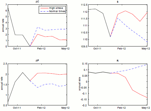 Finally, we turn to our second class of experiments, a conditional forecast that illustrates the importance of initial conditions for economic outcomes. Figure 4.9 shows two forecast paths beginning immediately following the end of our sample in 2011:12, one (the red solid line) conditional on a high stress regimes in both coefficients and variances, the other (the blue dashed line) on a low stress in both coefficients and variances. All else is held constant, and unlike the figures immediately above, there are no shocks other than those in history that set out the initial conditions for the scenario.