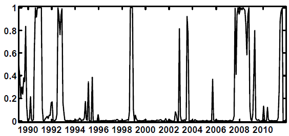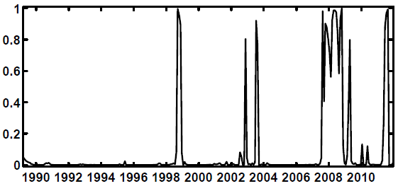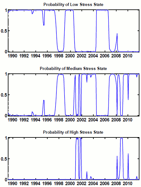 Taking Figure 4.1 and 4.2 together helps us understand the great recession. From Figure 4.1 we see that the period from 2004 to 2006 was a lengthy one where shock variances were in a low stress state (the upper panel of the figure); Figure 4.2 shows that this was also a period in which the coefficient state was low stress as well. Figure 2.1 shows that this was also the period in which the FSI itself was at a very low level for an extended period; in addition, interest rates were very low. In response, it is commonly alleged that financial firms began "chasing yield:" increasing leverage in order to magnify returns; see, e.g., Geanakoplos (2010) among many other references. Back on Figure 4.1, the economy then transitions in late 2006--about the time that prices of existing homes at the national level began to fall--to the medium-stress variance state (the middle panel). The crisis begins in earnest when the economy transitions in August 2007 to the high-stress coefficient state and finally reaches full bore in September 2008 when the variance state also jumps to high stress (the lower panel of Figure 4.1). All this leads to a proposed definition of a stress event: when the shock variance state is either medium or high, and the coefficient state is high. As can be seen in Figure 4.3 below, this definition eliminates the periods of high-stress coefficients in the early 1990s at which time there was apparently insufficient turbulence to create much in the way of difficulties for the real economy (although there was, in fact, a mild recession and a slow, "jobless" recovery). Also omitted from this status is the September 11, 2001 attacks and the associated extraordinary provision of liquidity by the Federal Reserve that followed those attacks.28 This definition leaves in, however, a spike in 1998 associated with the Russian debt default and the LTCM failure, two spikes that might be associated with the Argentine debt default or the failure of Worldcom, the great recession and a very recent spike connected to the European sovereign debt crisis.